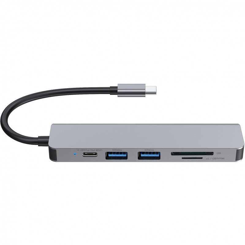 "Conceptronic DONN02G. Host interface: USB 3.2 Gen 1 (3.1 Gen 1) Type-C, USB Power Delivery up to: 60 W. Product colour: Aluminium, Compatible memory cards: MicroSD (TransFlash), MicroSDHC, SD, SDHC, SDXC, Hub interfaces: HDMI, USB 3.2 Gen 1 (3.1 Gen 1) Type-A, USB 3.2 Gen 1 (3.1 Gen 1) Type-C. Width: 35.8 mm, Depth: 120 mm, Height: 15 mm. Quantity per pack: 1 pc(s), Package width: 75 mm, Package depth: 25 mm. Cable length: 0.115 m"\n"This 6-in-1 USB-C to HDMI Adapter makes it possible to expand your device’s USB Type-C capacity with HDMI/USB-C PD/USB 3.0 ports and card readers (SD, MicroSD/TF). The adapter provides an easy way to add HDTV, or equipment such as a monitor or projector to any USB-C device such as a smartphone, portable gaming console, MacBook, Chromebook Pixel or any similar late-model laptop with USB-C ports. Perfect for home entertainment, office presentations and classroom teaching."