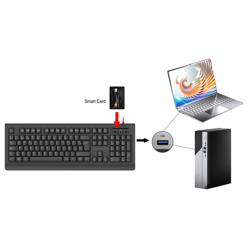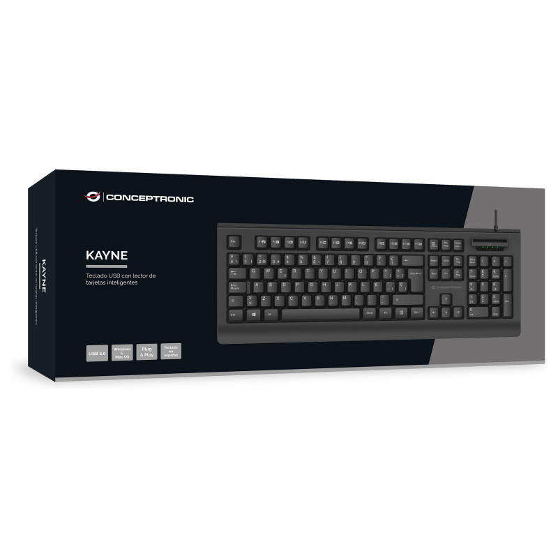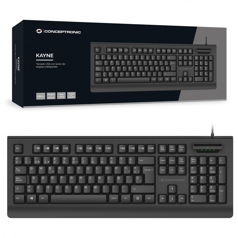 "Conceptronic KAYNE01ES USB Keyboard with Smart ID Card Reader, Spanish layout. Keyboard form factor: Full-size (100%), Connectivity technology: Wired, Device interface: USB, Keyboard layout: QWERTY, Keyboard number of keys: 105. Cable length: 1.5 m. Recommended usage: Office. Product colour: Black"\n"The USB Keyboard with Smart ID Card Reader is your ideal companion for online tax reporting, online banking, and online identification. The keyboard is fully compatible with Windows XP, Vista, 7, 10, and 11, as well as essential applications such as DNIe and eID."