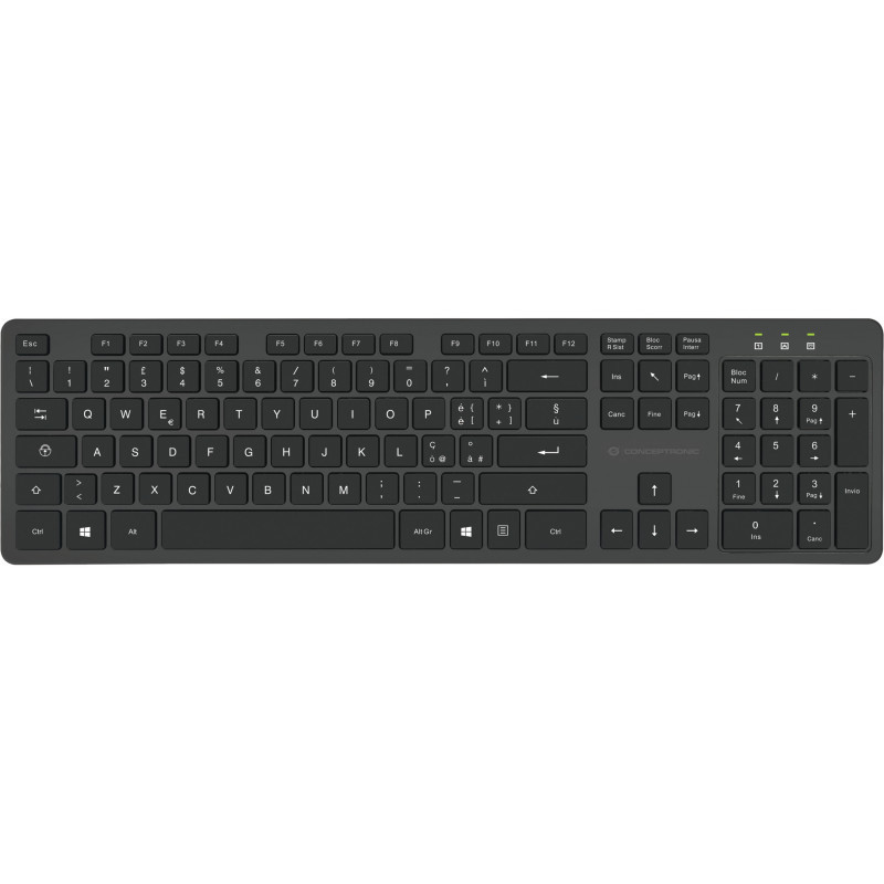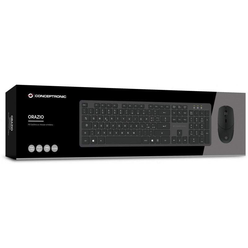"Conceptronic Wireless Keyboard & Mouse Kit, Italian layout. Keyboard form factor: Full-size (100%). Keyboard style: Straight. Connectivity technology: Wireless, Device interface: RF Wireless, Keyboard layout: QWERTY, Keyboard number of keys: 105, Recommended usage: Office. Product colour: Black. Mouse included"\n"This wireless keyboard and mouse kit is an essential companion for the home or office. Simply plug and play to get easy, seamless performance from your devices. The standard keyboard features a full suite of 105 soft-touch keys for accurate, comfortable typing. The cleverly-designed mouse comes with a DPI switch which can instantly adjust sensitivity, and rubberized finishing provides superior grip and comfort.