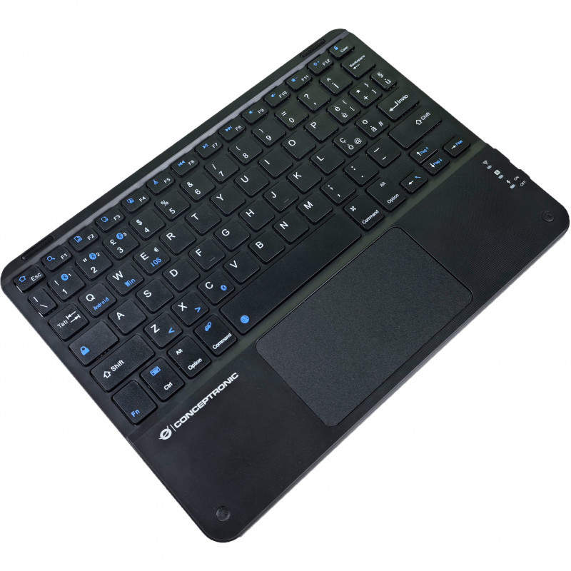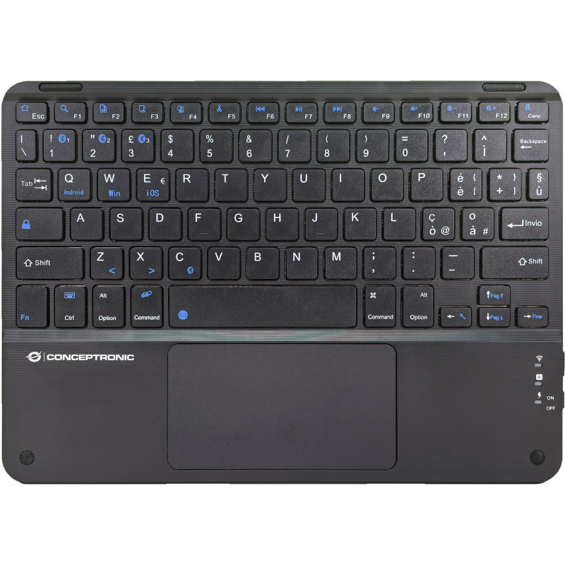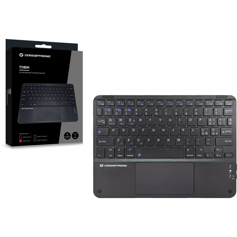 "Conceptronic TOBIN01BIT 10-inch Bluetooth Touchpad Keyboard, QWERTY Italian. Keyboard form factor: Tenkeyless (80 - 87%). Keyboard style: Straight. Connectivity technology: Wireless, Device interface: Bluetooth, Keyboard layout: QWERTY, Recommended usage: Universal. Product colour: Black"\n"The 10-inch Bluetooth Touchpad Keyboard is designed for ultimate convenience and versatility. Featuring Bluetooth 5.4 wireless connectivity for a stable and efficient connection, it allows you to connect up to three devices and switch between them with ease. Its rechargeable battery eliminates the hassle of constant replacements. Enjoy a comfortable typing experience combined with precise touch control for all your tasks."