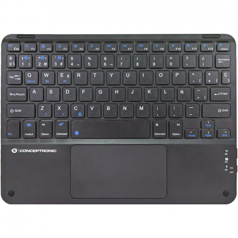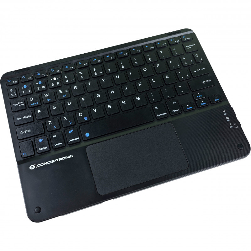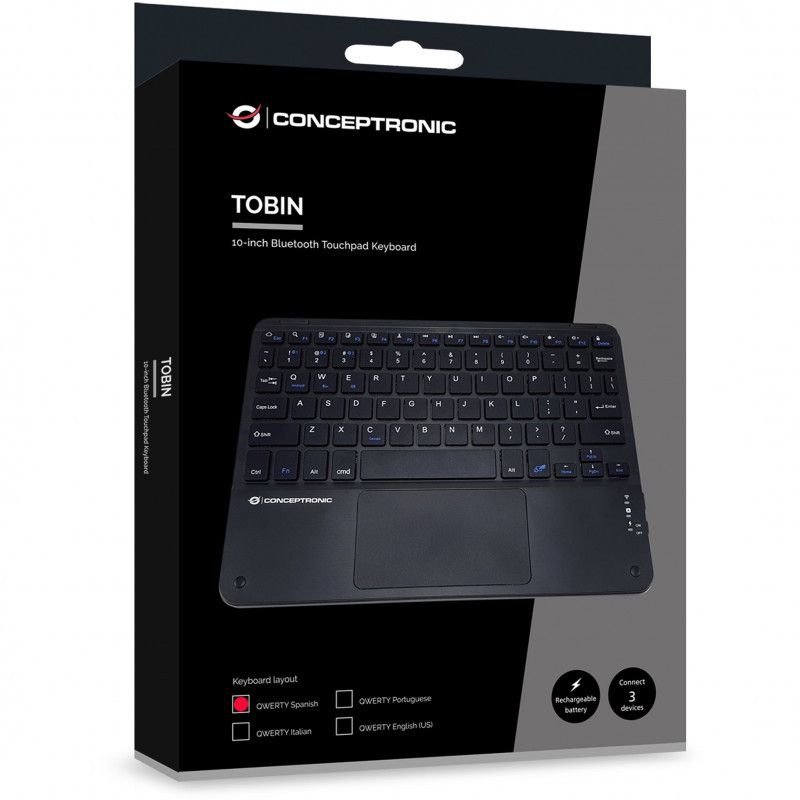 "Conceptronic TOBIN01BES 10-inch Bluetooth Touchpad Keyboard, QWERTY Spanish. Keyboard form factor: Tenkeyless (80 - 87%). Keyboard style: Straight. Connectivity technology: Wireless, Device interface: Bluetooth, Keyboard layout: QWERTY, Recommended usage: Universal. Product colour: Black"\n"The 10-inch Bluetooth Touchpad Keyboard is designed for ultimate convenience and versatility. Featuring Bluetooth 5.4 wireless connectivity for a stable and efficient connection, it allows you to connect up to three devices and switch between them with ease. Its rechargeable battery eliminates the hassle of constant replacements. Enjoy a comfortable typing experience combined with precise touch control for all your tasks."