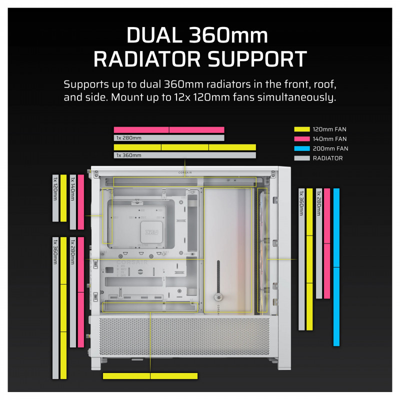 Customize your cooling setup with room for up to 12x 120mm fans, plus versatile radiator mounting options including up to dual 360mm radiators.