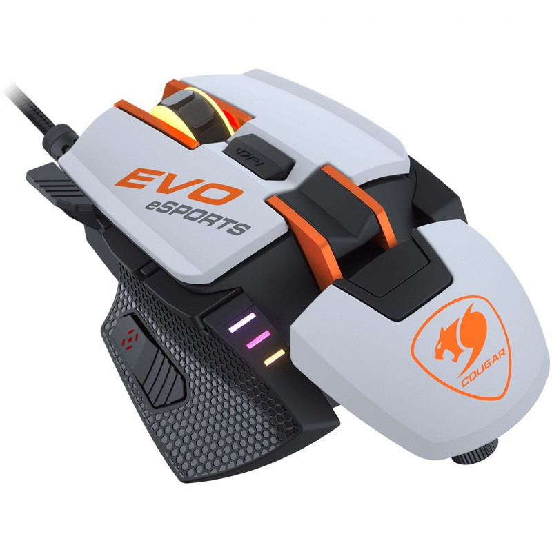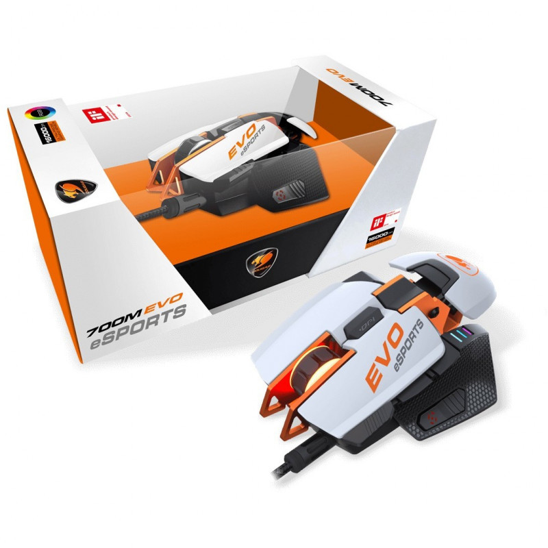 "COUGAR Gaming 700M EVO eSPORTS. Form factor: Right-hand. Movement detection technology: Optical, Device interface: USB Type-A, Movement resolution: 16000 DPI, Buttons type: Pressed buttons, Scroll type: Ball, Acceleration (max): 50 G. Illumination colour: Multi. Power source: Cable. Product colour: White"\n"16000 DPI Optical Gaming Mouse