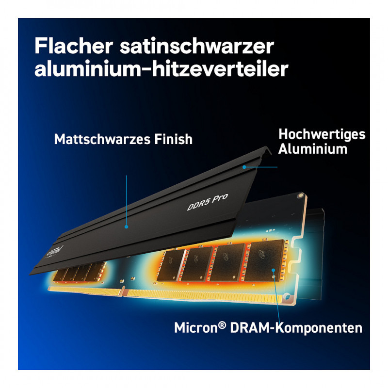 "Crucial Pro CP2K64G56C46U5. Component for: PC, Internal memory: 128 GB, Memory layout (modules x size): 2 x 64 GB, Internal memory type: DDR5, Memory clock speed: 5600 MHz, Memory form factor: 288-pin DIMM, CAS latency: 46"\n"Low-profile heat spreader
