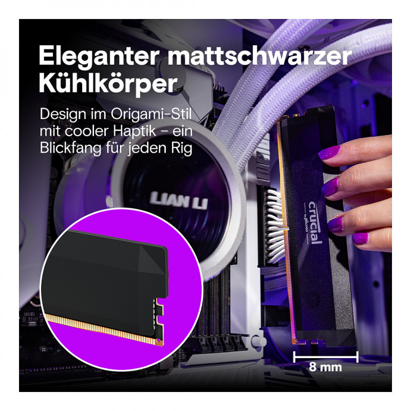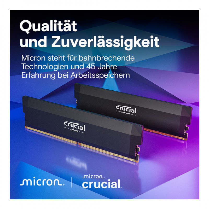 "Crucial Pro CP2K32G60C40U5B. Component for: PC, Internal memory: 64 GB, Memory layout (modules x size): 2 x 32 GB, Internal memory type: DDR5, Memory clock speed: 6000 MHz, Memory form factor: 288-pin DIMM, CAS latency: 40"\n"Unstoppable speed up to 6,400MHz