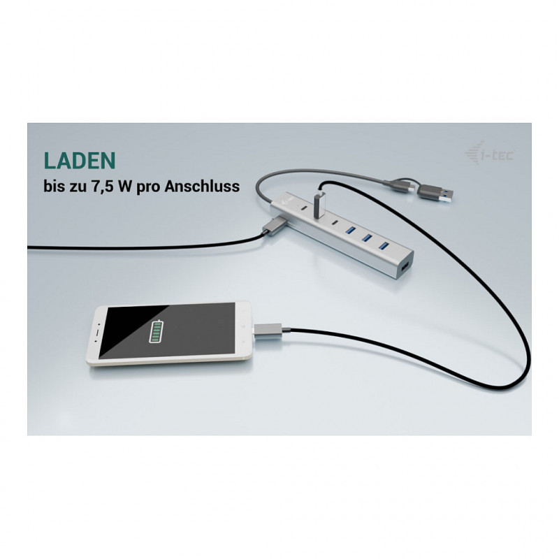 "i-tec USB-C/USB-A Charging Metal HUB 7 port (3x USB-C, 4x USB-A). Host interface: USB 3.2 Gen 1 (3.1 Gen 1) Type-A + Type-C, Hub interfaces: USB 3.2 Gen 1 (3.1 Gen 1) Type-A, USB 3.2 Gen 1 (3.1 Gen 1) Type-C. Data transfer rate: 5 Mbit/s, Product colour: Grey, Cable length: 0.3 m. Power consumption (max): 15 W. Other operating systems supported: Android, ChromeOS, iPadOS. Width: 157 mm, Depth: 30 mm, Height: 21 mm"\n"USB-A, USB-C, USB4 and Thunderbolt 3 or 4 are becoming increasingly popular on today’s laptops and tablets. Along with their increasing use, the number of USB ports on the body of laptops is decreasing. And if you need to connect accessories to your device that don’t have enough ports anymore, you can use this small but handy hub that also supports active charging.