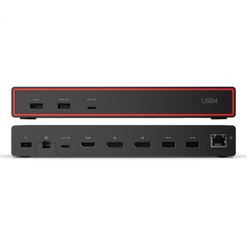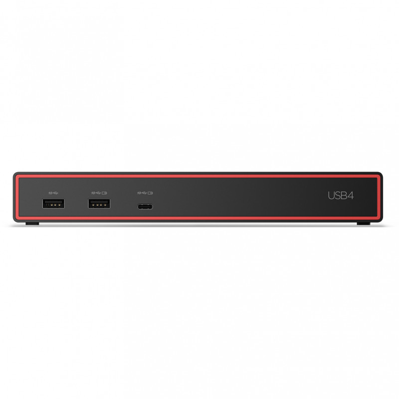 "Lenovo ThinkPad USB4 Dock 5000. Connectivity technology: Wired, Host interface: Thunderbolt 4, USB Power Delivery up to: 100 W. Ethernet LAN data rates: 1000 Mbit/s. Product colour: Black, Colour name: Eclipse Black, Maximum digital resolution: 3840 x 2160 pixels. Power source type: DC. Windows operating systems supported: Windows 11, Mac operating systems supported: Mac OS X 14.0 Sonoma, Mac OS X 15.0 Sequoia"\n"Designed to enhance everyday productivity, the Lenovo™ ThinkPad® USB4 Dock 5000 is the Successor of our famous Universal USB-C Dock equipped with cutting edge USB4 Technology, The dock can connect to your laptop with 40Gbps bandwidth USB4 upstream connectivity, that allows you to extend your monitor setup with more pixels and higher refresh rates. It can output 65W charge power to your laptop with 100W power adapter, or you can choose a 135W power adapter to boost the charge power up to 100W to you laptop."