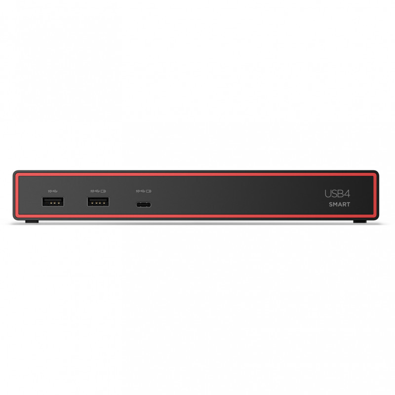 "Lenovo ThinkPad USB4 Smart Dock 5500. Connectivity technology: Wired, Host interface: USB4, USB Power Delivery up to: 65 W. Ethernet LAN data rates: 1000 Mbit/s. Product colour: Black, Colour name: Eclipse Black, Maximum digital resolution: 3840 x 2160 pixels. Power source type: AC, Power supply: 100 W. Width: 218 mm, Depth: 80 mm, Height: 31.5 mm"\n"Designed to enhance everyday productivity, the Lenovo™ ThinkPad® USB4 Smart Dock 5500 is at the cutting edge of our new series of USB docks, offering a smarter way to work. With the brand new Lenovo Accessories Fleet Manager(LAFM) powered by AWS for IT manager, and the dock have 40Gbps bandwidth with USB4 upstream connectivity to your laptop, that allows you to extend your monitor setup with more pixels and higher refresh rates."