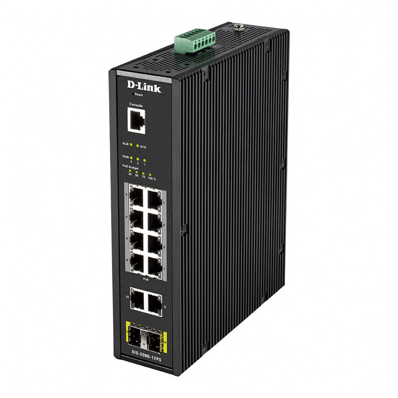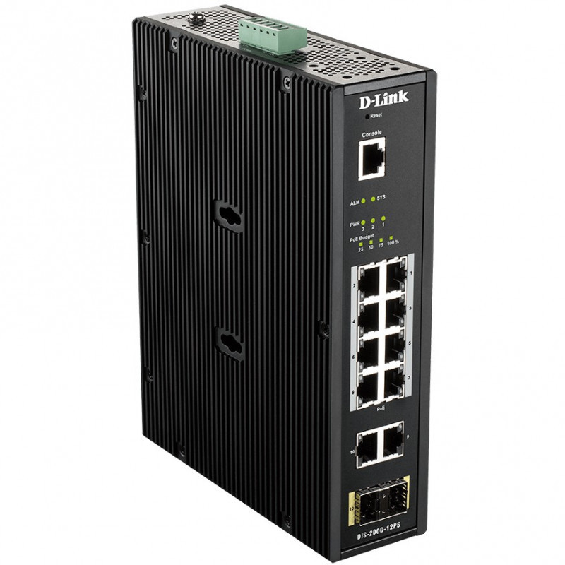 "D-Link 12-Port L2 Industrial Smart Managed Switch with 10 x 1GBaseT(X) (8 PoE 240W) & 2 x SFP. Switch type: Managed, Switch layer: L2. Basic switching RJ-45 Ethernet ports type: Gigabit Ethernet (10/100/1000), Basic switching RJ-45 Ethernet ports quantity: 10, Console port: RJ-45. Full duplex. MAC address table: 8000 entries, Switching capacity: 24 Gbit/s. Networking standards: IEEE 802.1D, IEEE 802.1Q, IEEE 802.1p, IEEE 802.1s, IEEE 802.1w, IEEE 802.1x, IEEE 802.3, IEEE.... DC input voltage: 46 - 54 V. Power over Ethernet (PoE). Wall mountable, Rack mounting"\n"Smart Management
