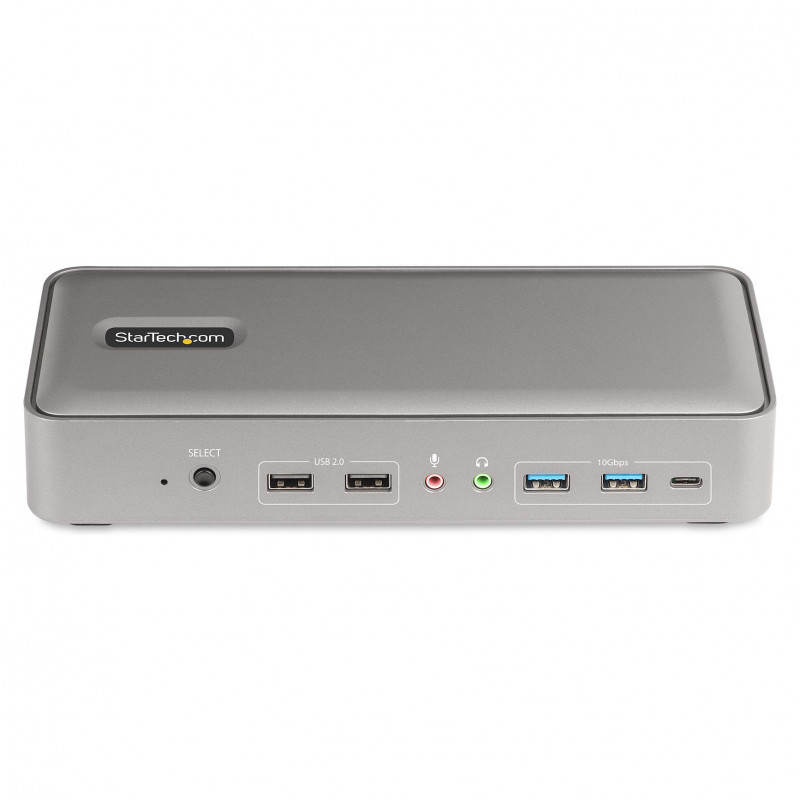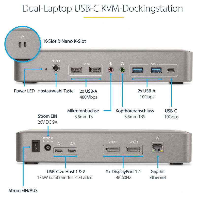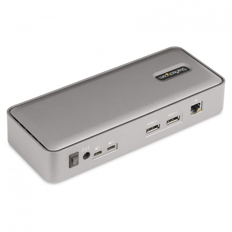 "StarTech.com Dual-Laptop USB-C KVM Docking Station, Dual Monitor 4K 60Hz DisplayPort Dock, 5-Port USB Hub, GbE, 90W/45W Power Delivery to Two Laptops, Windows/Mac, 2-Host KVM Dock - TAA. Keyboard port type: USB, Mouse port type: USB, Video port type: DisplayPort. Cabling technology: 10/100/1000Base-T(X), Networking standards: IEEE 802.3, IEEE 802.3ab, IEEE 802.3u. HD type: 4K Ultra HD, Maximum resolution: 3840 x 2160 pixels, Chipset: DisplayLink - DL6950, Genesys Logic - GL3590, Genesys Logic - GL9510, Parade - PS186, Realtek -.... Product colour: Silver, Housing material: Plastic, LED indicators: LAN, Power. Input voltage: 100 - 240 V, Input current: 2.4 A, Output voltage: 20 V"\n"Share a dual 4K 60Hz workstation between two laptop computers through a USB Type-C connection