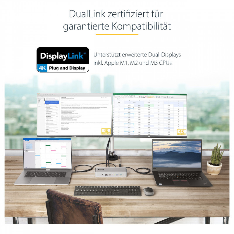 The Dock is DisplayLink Certified, for Plug and Display compatibility with Windows, ChromeOS, and macOS, enabling operation and switching between multiple computers with different operating systems. DisplayLink technology also supports extended dual displays on base Apple M-Series MacBooks, which are not natively capable of driving more than one external display. The DisplayLink Certification ensures support for resolutions up to 4K 60Hz on both external displays.