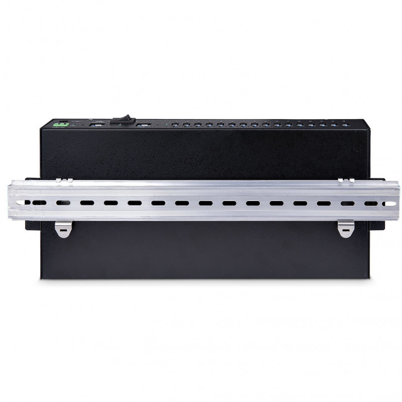 "StarTech.com 16-Port Industrial USB 3.0 Hub 5Gbps, Metal, DIN/Surface/Rack Mountable, ESD Protection, Terminal Block Power, up to 120W Shared USB Charging, Dual-Host Hub/Switch. Host interface: USB 3.2 Gen 1 (3.1 Gen 1) Type-B, Hub interfaces: USB 3.2 Gen 1 (3.1 Gen 1) Type-A. Data transfer rate: 5000 Mbit/s, Product colour: Black, Housing material: Steel. Power supply type: DC, Input voltage: 12 - 24 V, Power plug type: Type M. Width: 31 mm, Depth: 13 mm, Height: 44 mm. Package width: 130 mm, Package depth: 280 mm, Package height: 43 mm"\n"Add 16x USB 3.2 Gen 1 (5 Gbps) ports to two host computers, using this DIN-rail/Surface/Rack-mountable industrial hub