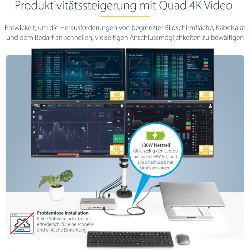 Push the boundaries of productivity with quad 4K 60Hz displays on Windows laptops running the latest Intel 12th Gen CPUs (or later) and DP 1.4 with DSC. Legacy systems still benefit from flexible dual or triple monitor setups.