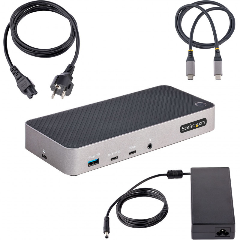 "StarTech.com USB-C Triple Monitor Docking Station - HDMI/DP Triple 4k USB-C Dock - 5x USB Hub - GbE - 100W PD - Universal Multi Monitor Docking Station - Thunderbolt 3/4 Compatible. Connectivity technology: Wired, Host interface: USB 3.2 Gen 2 (3.1 Gen 2) Type-C, USB Power Delivery up to: 100 W. Copper ethernet cabling technology: 10BASE-T, 100BASE-TX, 1000BASE-T, Networking standards: IEEE 802.3ab. Product colour: Grey, Silver, Data transfer rate: 10 Gbit/s, HD type: 4K Ultra HD. AC input voltage: 100 - 240 V, Input current: 2.5 A, Output voltage: 24 V. Windows operating systems supported: Windows 10, Windows 10 Education, Windows 10 Education x64, Windows 10 Enterprise, Windows 10..., Mac operating systems supported: Mac OS X 10.11 El Capitan, Mac OS X 10.12 Sierra, Mac OS X 10.14 Mojave, Mac OS X 10.15 Catalina,..., Mobile operating systems supported: Android"\n"Seamlessly standardize across platforms with triple 4K display support