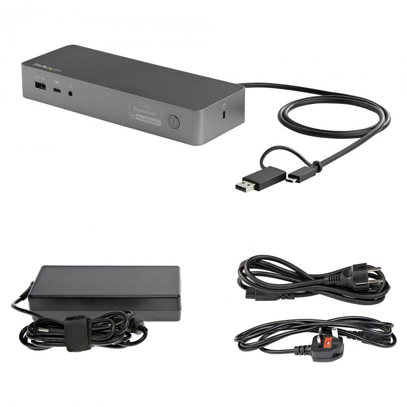 "StarTech.com Universal Laptop Docking Station, Hybrid USB-C & USB-A Dock, Dual 4K DP & HDMI, 100W PD, Mac / Windows / Chrome OS, 4x USB 5Gbps Hub, GbE. Connectivity technology: Wired, Host interface: USB 3.2 Gen 1 (3.1 Gen 1) Type-C, Headphone connectivity: 3.5 mm. Networking standards: IEEE 802.3, IEEE 802.3ab, IEEE 802.3u. Product colour: Black, Grey, Data transfer rate: 5 Gbit/s, Maximum digital resolution: 5120 x 2880 pixels. AC input voltage: 100 - 240 V, Input current: 2.5 A, Power supply: 100 W. Windows operating systems supported: Windows 10, Windows 10 Education, Windows 10 Education x64, Windows 10 Enterprise, Windows 10..., Mac operating systems supported: Mac OS X 10.11 El Capitan, Mac OS X 10.12 Sierra, Mac OS X 10.14 Mojave, Mac OS X 10.15 Catalina,..., Other operating systems supported: ChromeOS"\n"Dual 4K60 | DisplayPort and/or HDMI | USB-IF Certified | 3x USB-A | 1x USB-C | Mac, Windows® & Chrome OS™ | Lock Slot
