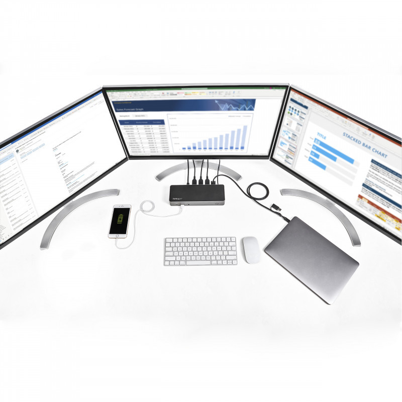 This USB-C Gen 2 10Gbps docking station turns your USB-C ® or Thunderbolt™ 3 MacBook Pro, Windows laptop, and Chromebook into a powerful workstation. A USB 3.2 Gen 2 Type-C dock features everything you need, from triple HDMI or DisplayPort video outputs up to 4K 60 Hz to 10Gbps USB-C & USB-A downstream peripheral ports to 85W Power Delivery. Older USB-A laptops are supported through universal hybrid USB-C/USB-A cable included.