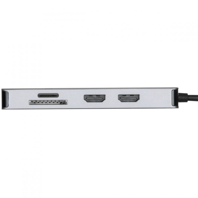 "Targus DOCK423EU. Connectivity technology: Wired, Host interface: USB 3.2 Gen 1 (3.1 Gen 1) Type-C, USB Power Delivery up to: 100 W. Product colour: Silver, Compatible memory cards: MicroSD (TransFlash), SD, Country of origin: China. Mac operating systems supported: MacOS, Mobile operating systems supported: iPadOS, Other operating systems supported: ChromeOS. Width: 150 mm, Depth: 100 mm, Height: 30 mm"\n"Turn your laptop into a dual video workstation with the compact USB-C Alt. Mode Dual HDMI 4K Docking Station with 100W PD Pass-Thru. Connect your USB-C-enabled devices to two HDMI monitors, while also connecting to a Gigabit Ethernet network, and plugging in your key peripherals — like mice, keyboards, flash drives, or hard drives — into the USB-A ports.