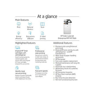 "HP Color LaserJet Enterprise MFP M776dn. Print technology: Laser, Printing: Colour printing, Maximum resolution: 1200 x 1200 DPI, Print speed (colour, normal quality, A4/US Letter): 46 ppm. Copying: Colour copying, Maximum copy resolution: 600 x 600 DPI. Scanning: Colour scanning, Optical scanning resolution: 600 x 600 DPI. Duplex functions: Print. Maximum ISO A-series paper size: A3. Wi-Fi. Direct printing. Product colour: Black, White"\n" Expect brilliant colour prints from advanced MFPs, equipped with JetIntelligence technology. Offering the world’s most secure printing [1] and a wide range of paper handling features, this is printing that helps save time and simplifies workflows.