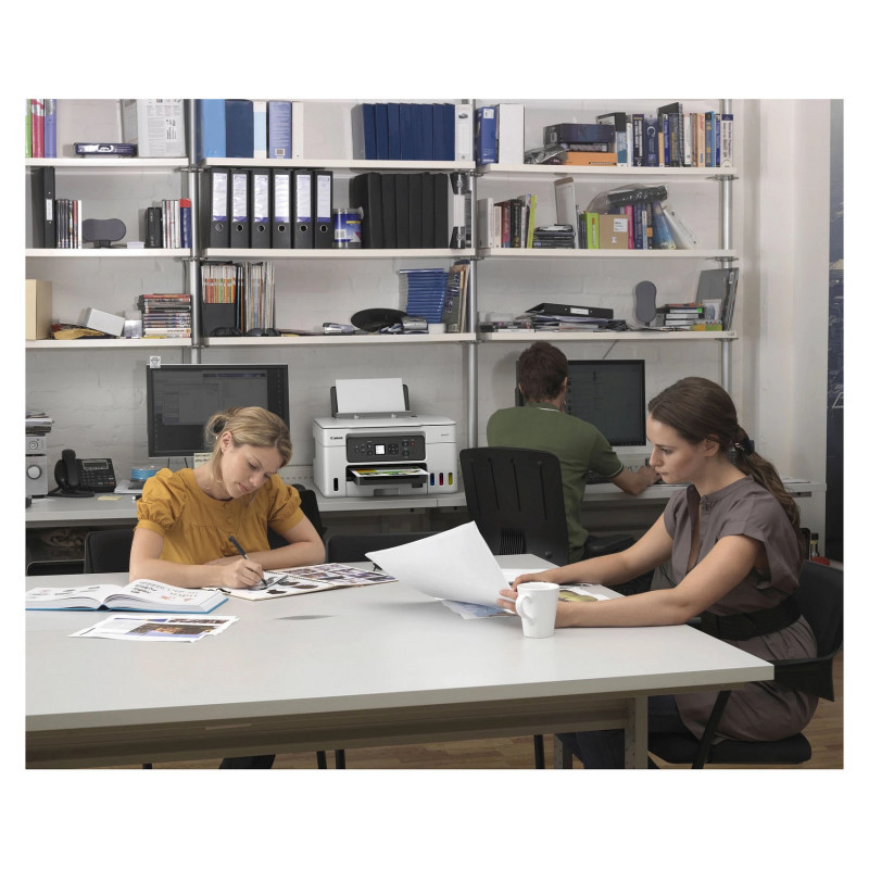 "Canon MAXIFY GX3050. Print technology: Inkjet, Printing: Colour printing, Maximum resolution: 600 x 1200 DPI. Copying: Colour copying. Scanning: Colour scanning, Optical scanning resolution: 1200 x 2400 DPI. Duplex functions: Copy, Print. Maximum ISO A-series paper size: A4. Wi-Fi. Direct printing. Product colour: Black, White"\n"Print large volumes of high-quality business documents while making huge savings on CPP and TCO with this refillable and easy to use 3-in-1 MegaTank-equipped MAXIFY GX printer.