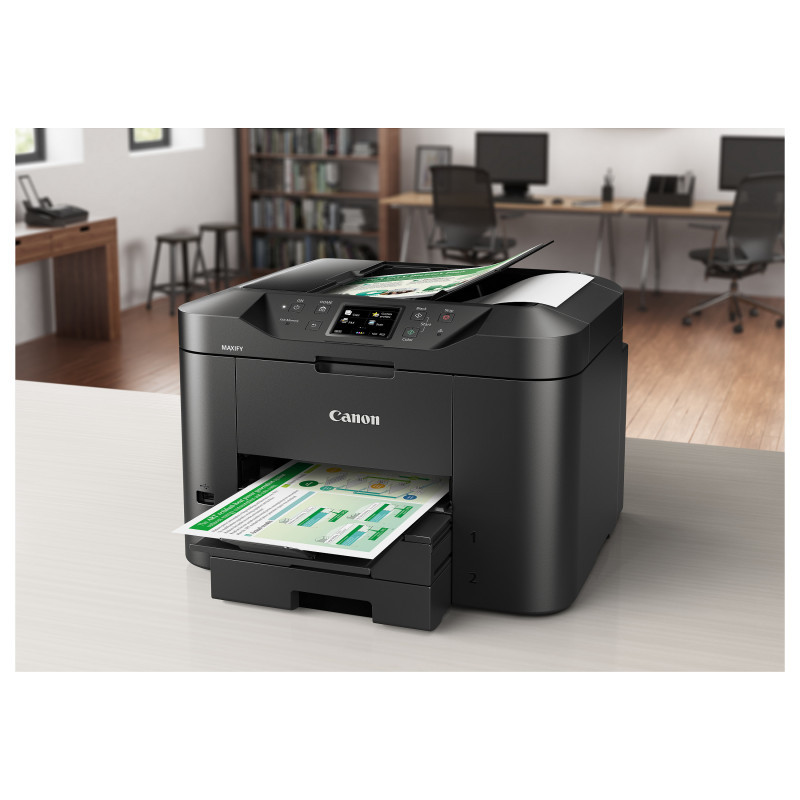 "Canon MAXIFY MB2750. Print technology: Inkjet, Printing: Colour printing, Maximum resolution: 600 x 1200 DPI, Print speed (colour, normal quality, A4/US Letter): 15.5 ppm. Copying: Colour copying. Scanning: Colour scanning, Optical scanning resolution: 1200 x 1200 DPI. Faxing: Colour faxing. Maximum ISO A-series paper size: A4. Wi-Fi. Product colour: Black"\n"All-In-One colour inkjet for home offices. The Canon MAXIFY MB2750 Series provides mobile printing and cloud integration, while its 500-sheet paper capacity and fast 24 ipm mono print speed maximise productivity.