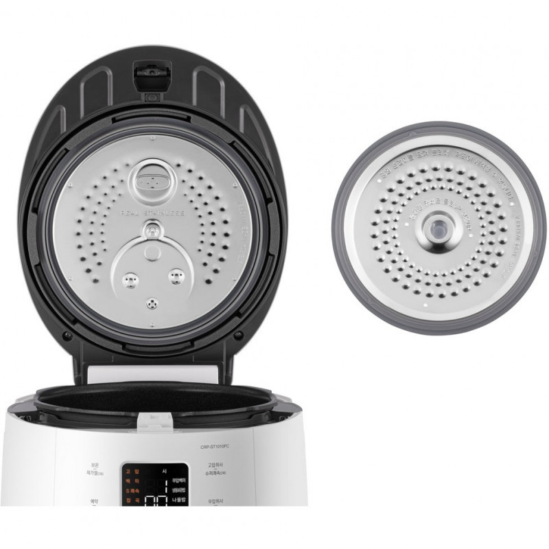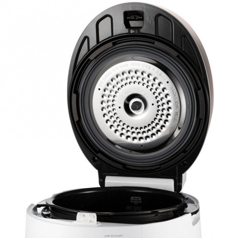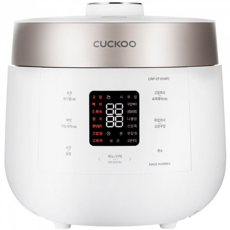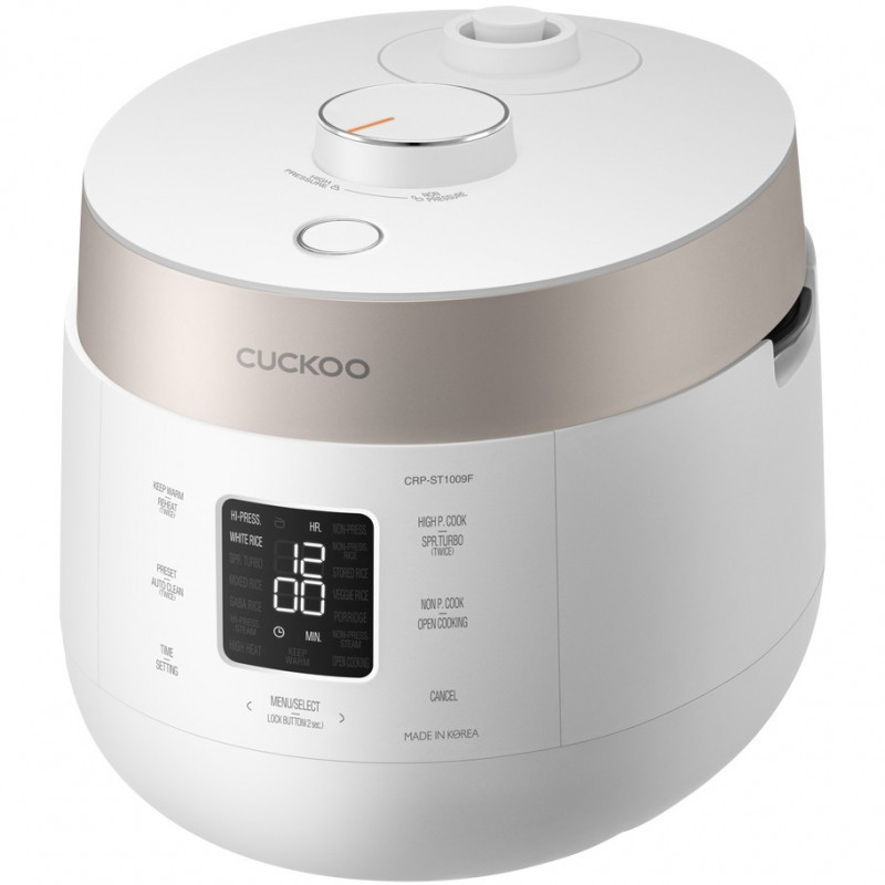 "Cuckoo CRP-ST1009F. Product colour: Champagne, White, Volume: 1.8 L, Display type: LCD. Power: 1150 W, AC input voltage: 220 - 240 V, AC input frequency: 50 Hz. Width: 290 mm, Depth: 283 mm, Height: 389 mm. Package weight: 9 kg. Country of origin: South Korea"\n