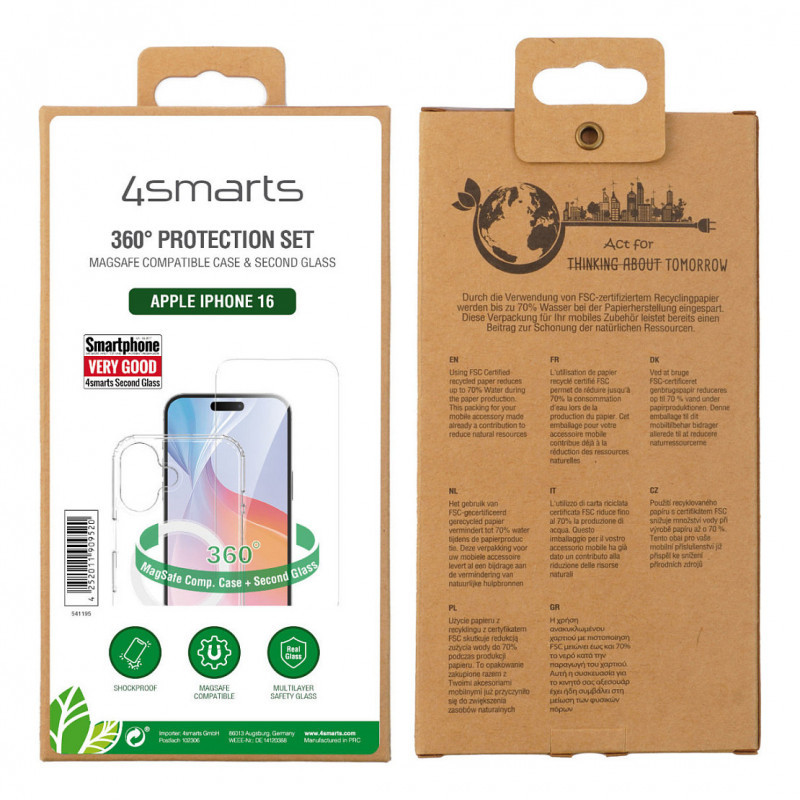 "4smarts 360° Premium Protection Set for Apple iPhone 16 MagSafe compatible. Case type: Cover, Brand compatibility: Apple, Compatibility: iPhone 16, Maximum screen size: 15.5 cm (6.1""), Product colour: Transparent"\n"MagSafe compatible