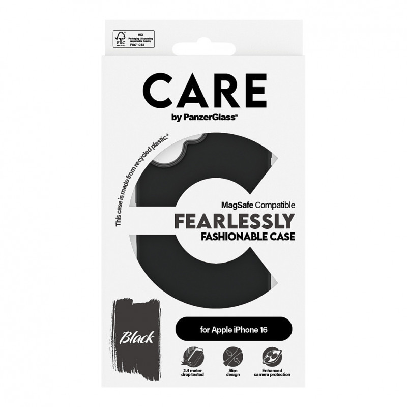 "PanzerGlass CARE™ by ® Case Black w. MagSafe iPhone 16. Case type: Cover, Brand compatibility: Apple, Compatibility: Apple - iPhone 16, Product colour: Black"\n"A Case for the Fearlessly Fashionable