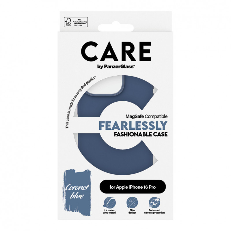 "PanzerGlass CARE™ by ® Case Blue w. MagSafe iPhone 16 Pro. Case type: Cover, Brand compatibility: Apple, Compatibility: Apple - iPhone 16 Pro, Product colour: Blue"\n"A Case for the Fearlessly Fashionable