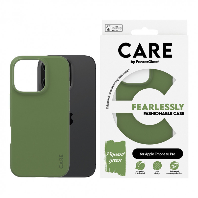 "PanzerGlass CARE™ by ® Case Green iPhone 16 Pro. Case type: Cover, Brand compatibility: Apple, Compatibility: Apple - iPhone 16 Pro, Product colour: Green"\n"Fearlessly Fashionable, BABY!