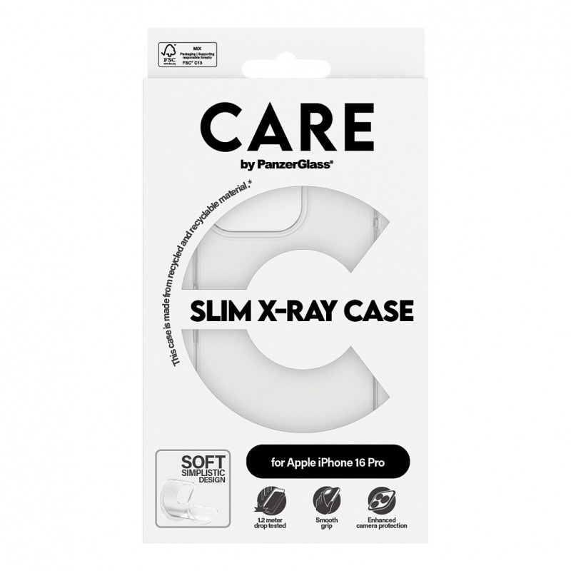 "PanzerGlass CARE™ by ® X-Ray Case iPhone 16 Pro. Case type: Cover, Brand compatibility: Apple, Compatibility: Apple - iPhone 16 Pro, Product colour: Transparent"\n"A clear choice for protection and style. Let your phone’s true color shine through. With a soft, slim design, this protective case is durable inside and out. And with its smooth grip it looks as good as it feels. Drop-tested at 1.2 meters, this case is designed to endure everyday falls and scratches. The X-Ray case, made from recycled plastic, is designed for wireless charging and enhanced camera protection.