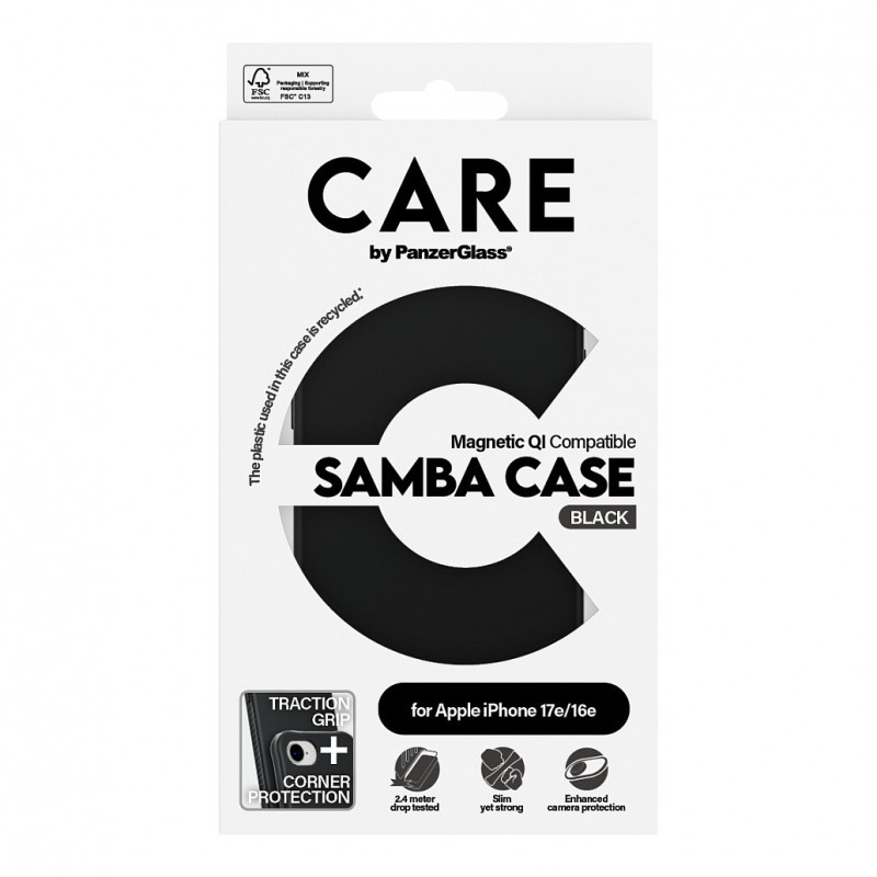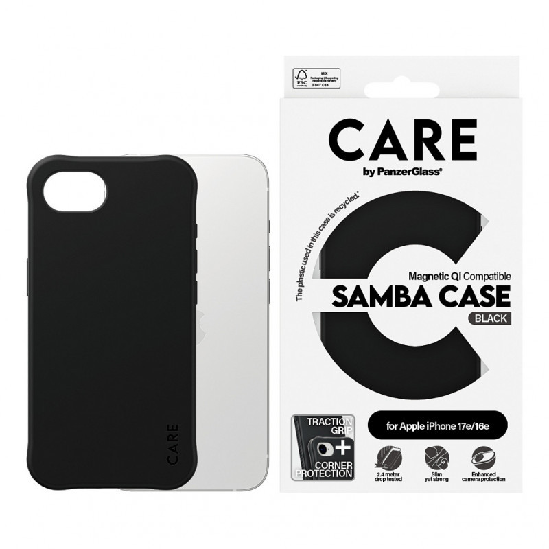 "PanzerGlass CARE™ by ® Samba Case Black w. Qi Compatible iPhone 17e | 16e. Case type: Cover, Brand compatibility: Apple, Compatibility: Apple - iPhone 16e, Apple - iPhone 17e, Product colour: Black"\n"Protect Your Tech in Style