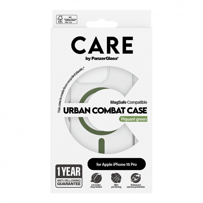 "PanzerGlass CARE™ by ® Urban Combat Case Transparent w. Green MagSafe iPhone 16 Pro. Case type: Cover, Brand compatibility: Apple, Compatibility: Apple - iPhone 16 Pro, Product colour: Transparent"\n"Our top pick. Call sign bombshell. Phenomenal protection designed for urban exploration and adventure. Every angle and corner has been drop tested at 4.8 meters. The Urban Combat case, made from recycled plastic, is designed for wireless charging and MagSafe compatibility. And it comes with our 1 Year Anti-Yellowing guarantee – no questions asked.