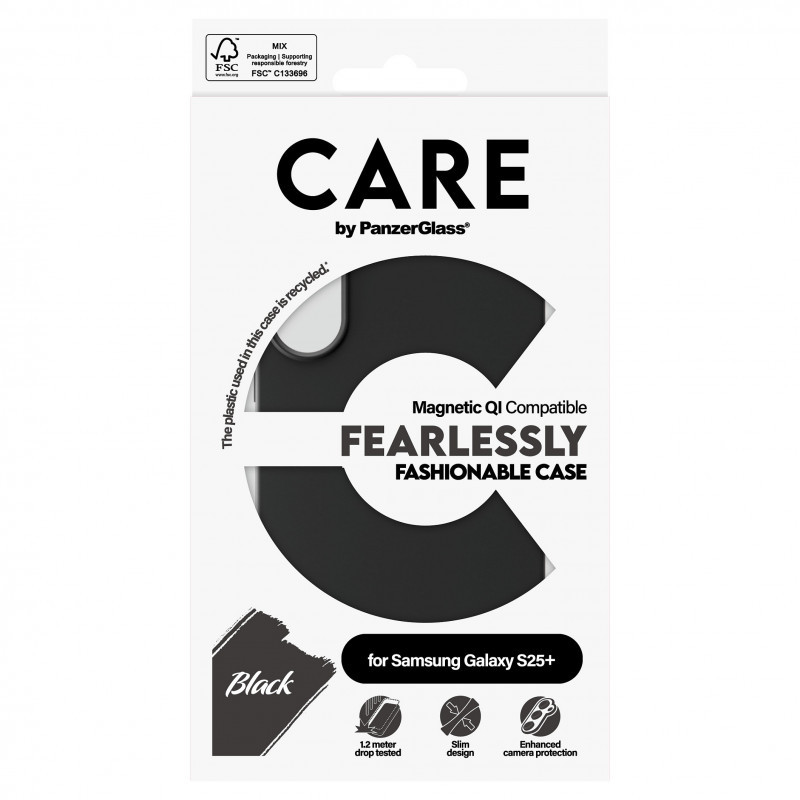 "PanzerGlass CARE™ by ® Case Black w. Qi Compatible Samsung Galaxy S25+. Case type: Cover, Brand compatibility: Samsung, Compatibility: Samsung - Galaxy S25+, Product colour: Black"\n"A Case for the Fearlessly Fashionable