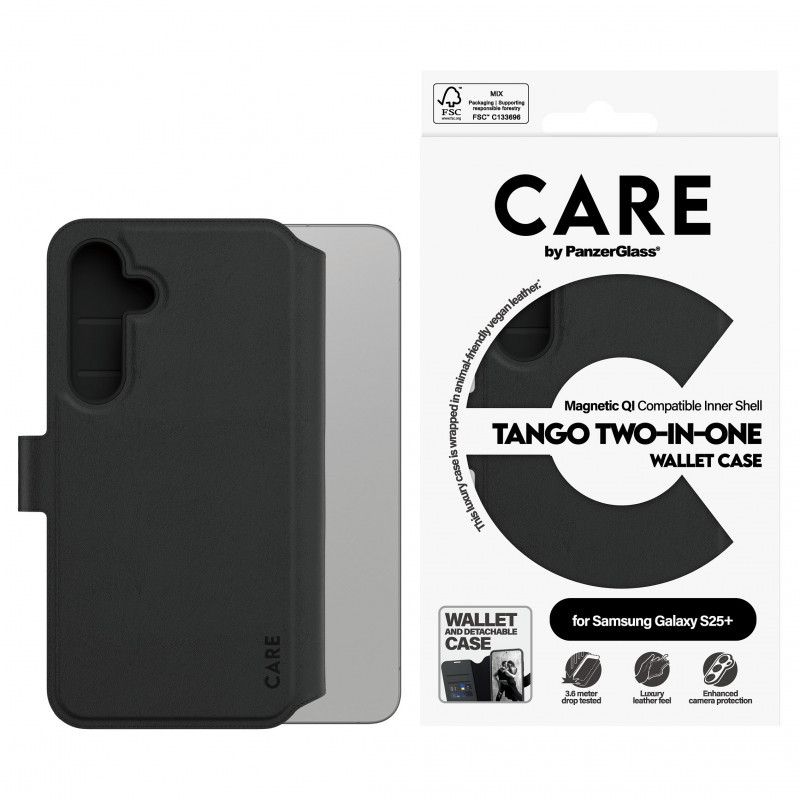 "PanzerGlass CARE™ by ® Tango 2-in-1 Wallet Case w. Qi Compatible Samsung Galaxy S25+. Case type: Cover, Brand compatibility: Samsung, Compatibility: Samsung - Galaxy S25+, Product colour: Black"\n"Tango Two-in-One Wallet Case