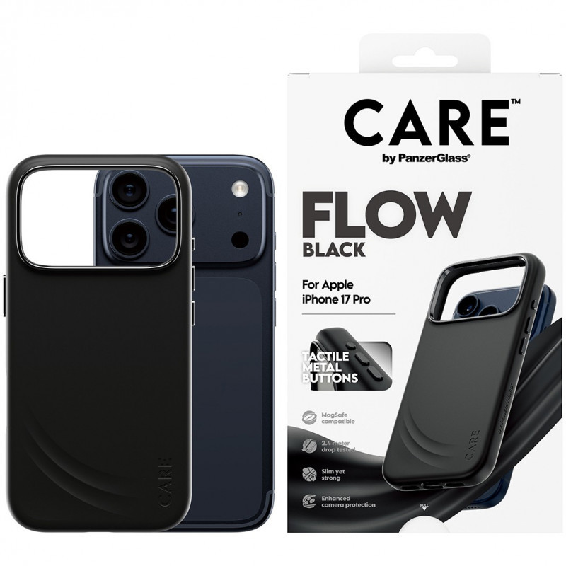 "PanzerGlass CARE by ® Feature FLOW Case Black w. MagSafe iPhone 17 Pro. Case type: Cover, Brand compatibility: Apple, Compatibility: Apple - iPhone 17 Pro, Surface coloration: Monochromatic, Product colour: Black"\n"Feel the flow! The CARE by PanzerGlass® Feature Flow Case with MagSafe is more than just a pretty face – it's your phone’s new best friend. The case is made with 60% recycled silicone and a soft-touch coating to wrap your device in everyday elegance and eco-love. Inside, a velvety microfiber lining gives your phone the care it deserves, while the raised bumper keeps your screen protected from fatal face-down falls.