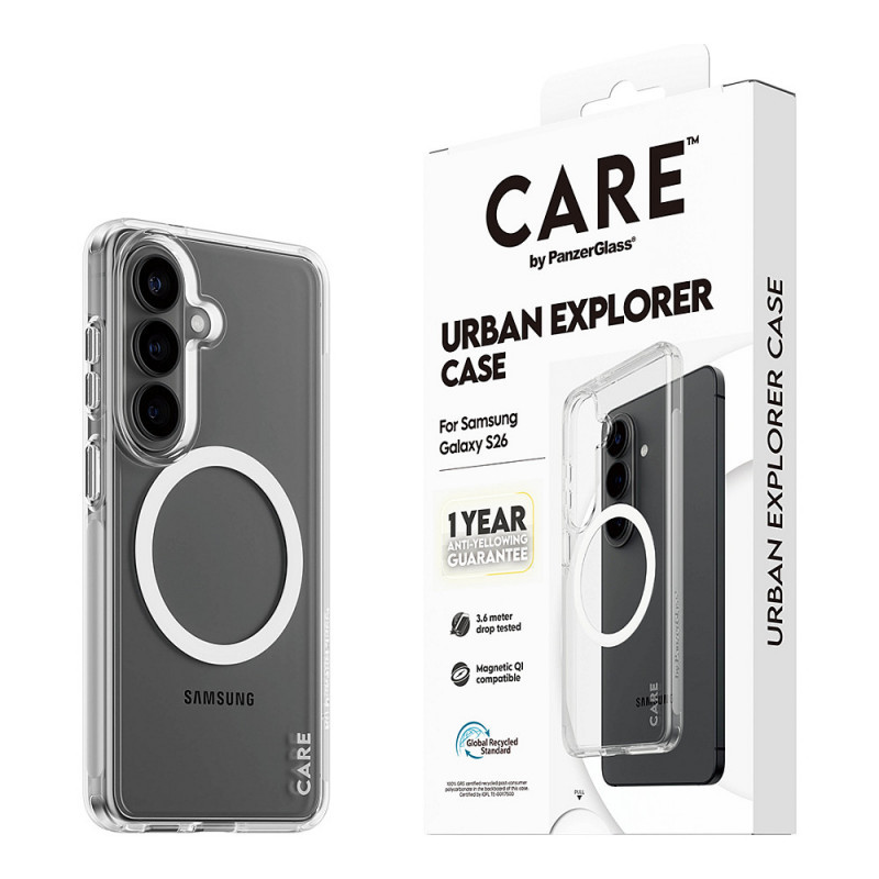 PanzerGlass CARE Urban Explorer Case – tai atsparus smūgiams apsauginis dėklas, skirtas Samsung Galaxy S26 modeliui. Skaidrus dizainas su baltais akcentais (Clear w/ White) leidžia išlaikyti telefono originalią išvaizdą, tuo pačiu suteikiant modernų ir švarų stilių.