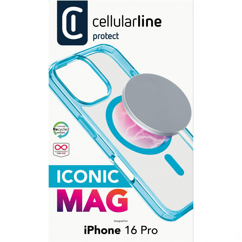 "Cellularline Iconic Mag - iPhone 16 Pro Transparent case with colored edges compatible with Magsafe ecosystem. Case type: Cover, Brand compatibility: Apple, Compatibility: iPhone 16 Pro, Maximum screen size: 16 cm (6.3""), Surface coloration: Monochromatic, Product colour: Blue"\n"ICONIC MAG is a case that combines color and transparency, designed to interact perfectly with the MagSafe® ecosystem. Thanks to the integrated magnets, the case aligns with the phone ensuring optimal compatibility with all MagSafe magnetic accessories. The colored semi-transparent edges combined with the full-color magnet add a touch of style, while the dual-material structure offers greater protection for edges and connectors. The raised edges in the camera and display area provide additional protection against bumps and scratches. With ICONIC MAG, your phone is protected and always ready to be used with the MagSafe ecosystem."
