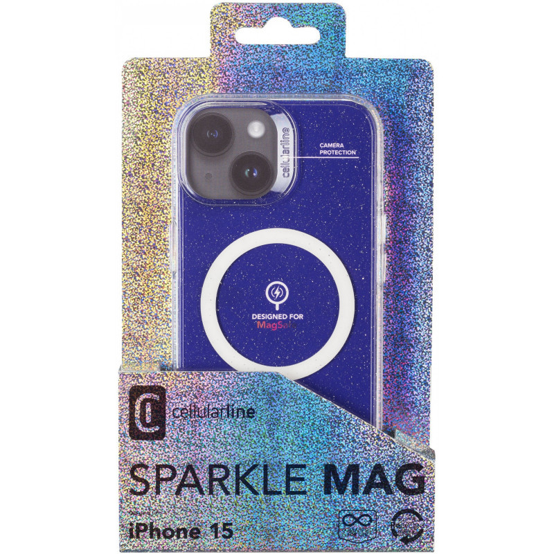 "Cellularline Sparkle Mag - iPhone 15 Ecosystem-compatible glitter finish case MagSafe. Case type: Cover, Brand compatibility: Apple, Compatibility: iPhone 15, Maximum screen size: 15.5 cm (6.1""), Surface coloration: Monochromatic, Product colour: Transparent"\n"SPARKLE MAG is the glamorous and super-protective glitter finish case. Designed to interact with the Apple MagSafe® ecosystem, thanks to the integrated magnets, the case aligns perfectly with the phone and allows for perfect compatibility with all magnetic accessories. It wraps around the smartphone, protecting its edges and buttons without altering its design."