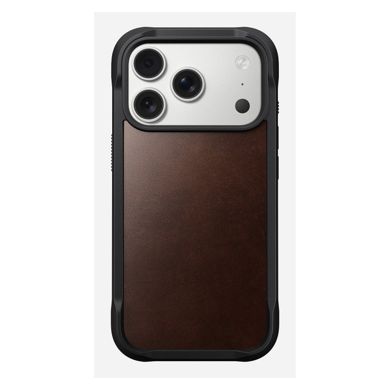 "Nomad Rugged Leather Case. Case type: Cover, Brand compatibility: Apple, Compatibility: iPhone 17 Pro, Maximum screen size: 16 cm (6.3""), Surface coloration: Monochromatic, Product colour: Brown"\n"Rugged Leather Case for iPhone 17 Pro pairs the sophistication of Horween leather with a tough polycarbonate bumper and fortified corner bumpers for a case that’s as stylish as it is protective.