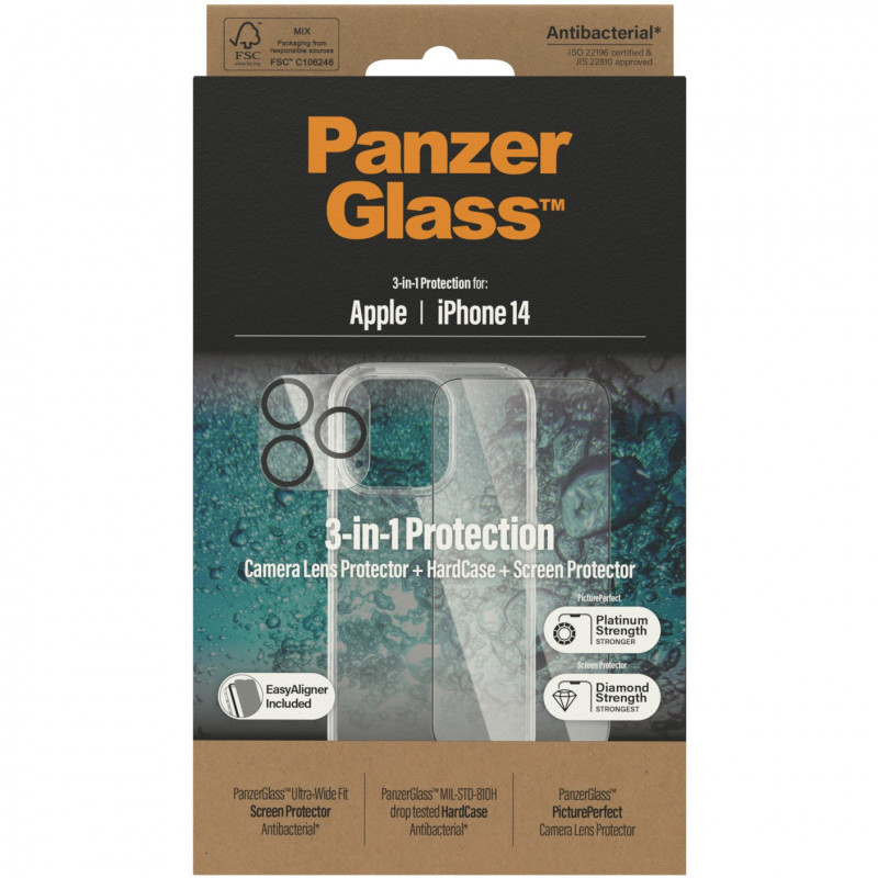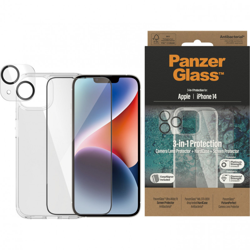"PanzerGlass ® 3-in-1 Pack iPhone 14. Brand compatibility: Apple, Compatibility: Apple - iPhone 14. Dry application. Protection features: Scratch resistant, Shock resistant, Anti-bacterial. Material: Tempered glass, Silicone, Polyethylene terephthalate (PET), Product colour: Transparent. Quantity per pack: 1 pc(s)"\n"Want to protect your phone? I mean REALLY protect your phone? Then this 3-in-1 protection pack from PanzerGlass® is for you! Featuring a PicturePerfect Camera Lens Protector, a wireless charging compatible HardCase and an Ultra-Wide Fit Screen Protector, this pack keeps your phone safe from bumps against sharp-edged dangers, falls onto stone-hard pavements and just about anything else life can throw at you. The screen protector even has a smudge-free coating with antibacterial effect that reduces traces of fingerprints and kills up to 99.99% of all common surface bacteria.