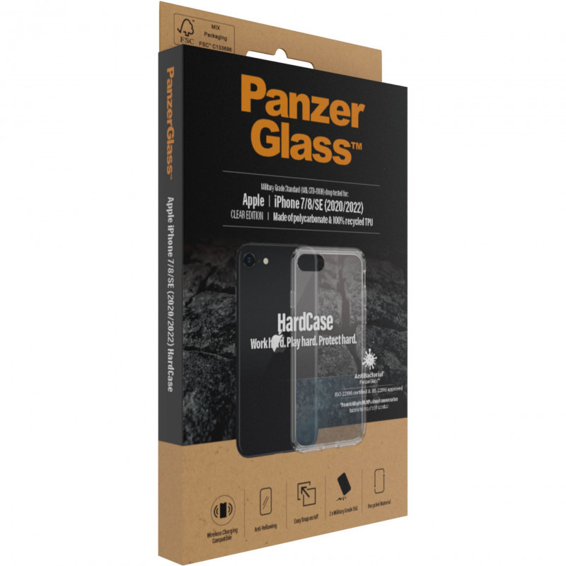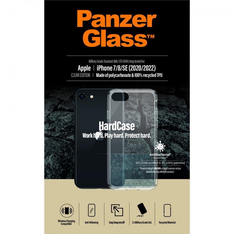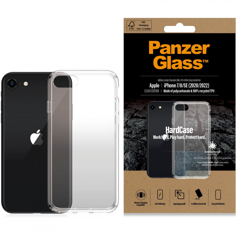 "PanzerGlass ® HardCase iPhone SE (2020/2022) | 7 | 8. Case type: Cover, Brand compatibility: Apple, Compatibility: Apple - iPhone SE 2022, Apple - iPhone SE 2020, Product colour: Transparent"\n"Put the design of your phone at center stage with the PanzerGlass® ClearCase. The case features a soft frame in classic black combined with a transparent back cover made of toughened glass, also called tempered glass, that provides a clear view of your phone’s beautiful design. It has been drop-tested under 2 x Military Grade Standard conditions, which means it can withstand several drops from a height of 2.4 meters or a running-down-the-stairs-and-accidently-dropping-my-device kind of height. The ClearCase also provides an extra level of protection from germs and bacteria by featuring an innovative anti-bacterial coating that is proven to kill up to 99.99% of the most common surface bacteria.