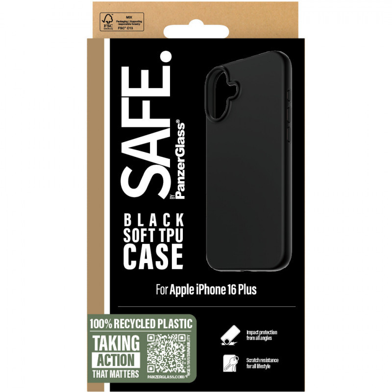 "PanzerGlass SAFE. by ® TPU Case Black iPhone 16 Plus. Case type: Cover, Brand compatibility: Apple, Compatibility: Apple - iPhone 16 Plus, Product colour: Black"\n"Protect your phone from pocket plunges, backseat bumps and freaky Friday-night falls with the Soft TPU Case from SAFE. by PanzerGlass®. The thin, sleek and black case is made of 100% recycled plastic and shields your phone effectively while giving you full access to all of its functions. It is wireless charging compatible and anti-yellowing, ensuring that your case will continue to look good, day after day – even when exposed to sunlight and beach parties. The Soft TPU Case protects and prolongs the lifetime of your phone so that one day you can pass it on to someone else who will love it just as much as you do. This is one way of working toward a more sustainable future. Another is to use more sustainable packaging. So, of course, this product comes in a recyclable FSC™-certified box. Installation is easy. Just click on the case and you can breathe freely, knowing that you’ll never again fear the terrifying sight of your phone tumbling to the ground. This may not happen, but if it does, you’ll regret not having clicked “add to cart”. And remember: If you want to take extra good care of your phone, you can combine the case with a screen protector and a camera lens protector from SAFE. by PanzerGlass®. Keep your phone SAFE."