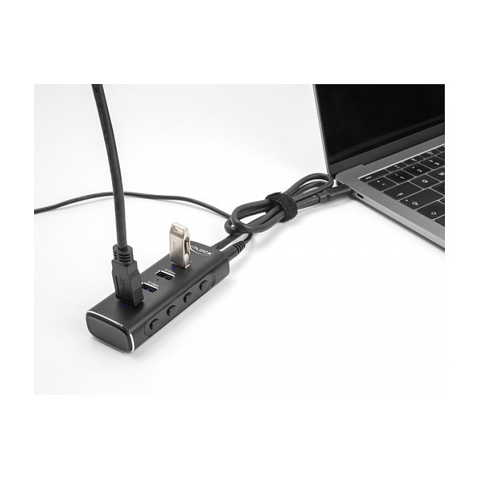 "DeLOCK 4 Port USB 10 Gbps Hub with USB Type-C connector 60 cm Cable and Switch for each port. Host interface: USB 3.2 Gen 1 (3.1 Gen 1) Type-C, Hub interfaces: USB 3.2 Gen 1 (3.1 Gen 1) Type-A. Data transfer rate: 10000 Mbit/s, Product colour: Black, Housing material: Metal. Power supply type: DC, Input voltage: 100 - 240 V, Input current: 0.5 A. Windows operating systems supported: Windows 10, Windows 11, Windows 8.1, Mac operating systems supported: MacOS, Linux operating systems supported: Linux Kernel 5.15. Width: 39 mm, Depth: 98 mm, Height: 22 mm"\n"This solid USB hub by Delock with metal housing can be connected to a computer, laptop or mobile device via the USB-C™ interface. It expands the computer by 4 USB Type-A ports. Different USB devices such as USB flash memory, card reader, external enclosure etc. can be connected. Each port can be turned on or off individually by using the switches.