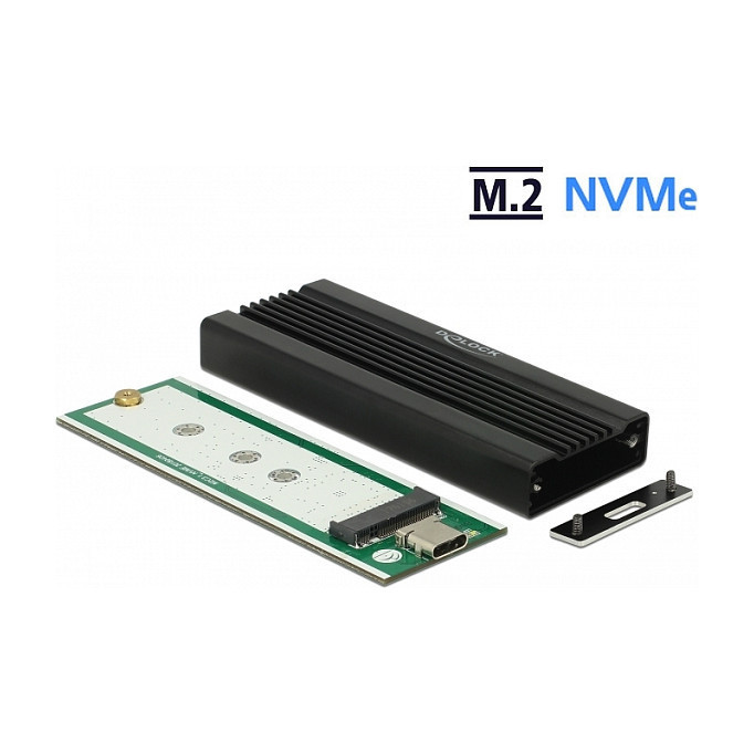 "DeLOCK 42600. Host interface: M.2, Output interface: USB 3.2 Gen 1 (3.1 Gen 1). Product colour: Black, LED indicators: Activity, Power. Chipset: JMicron JMS583, Data transfer rate (max): 10 Gbit/s. Windows operating systems supported: Windows 10, Windows 7, Windows 7 x64, Windows 8, Windows 8 x64, Windows 8.1, Windows 8.1 x64, Mac operating systems supported: Mac OS X 10.13 High Sierra, Other operating systems supported: ChromeOS. Width: 34 mm, Depth: 102 mm, Height: 12 mm"\n"This enclosure by Delock enables the installation of an M.2 PCIe NVMe SSD in 2280, 2260, 2242 and 2230 format, it can be connected via USB to the PC or laptop. The robust metal housing with cooling fins on the top ensures an optimum temperature of the memory."