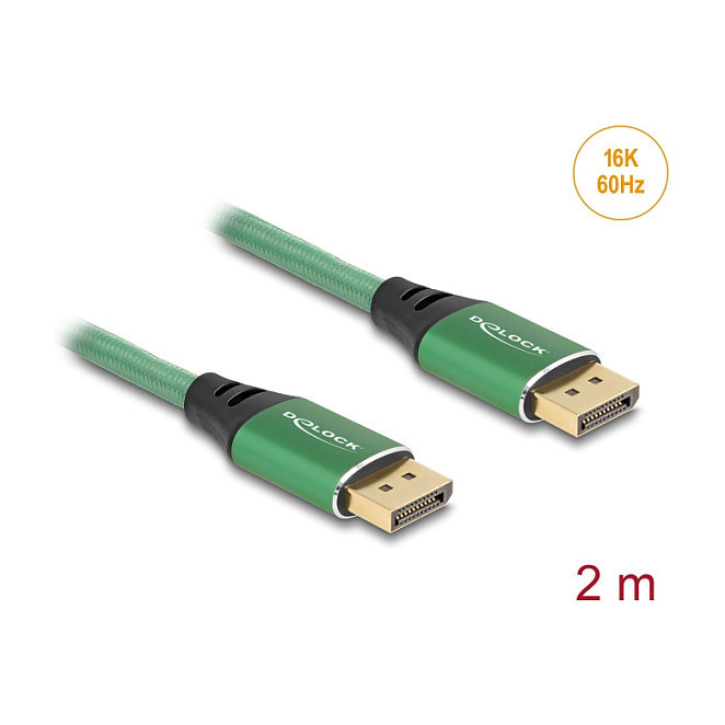 "DeLOCK DisplayPort Cable 16K 60 Hz 2 m green metal. Cable length: 2 m, Connector 1: DisplayPort, Connector 2: DisplayPort. Cable diameter: 6 mm. Package type: Hanging box. Quantity per pack: 1 pc(s)"\n"This cable by Delock is used to connect devices with a DisplayPort interface, such as monitors or TVs, to a PC or a laptop.