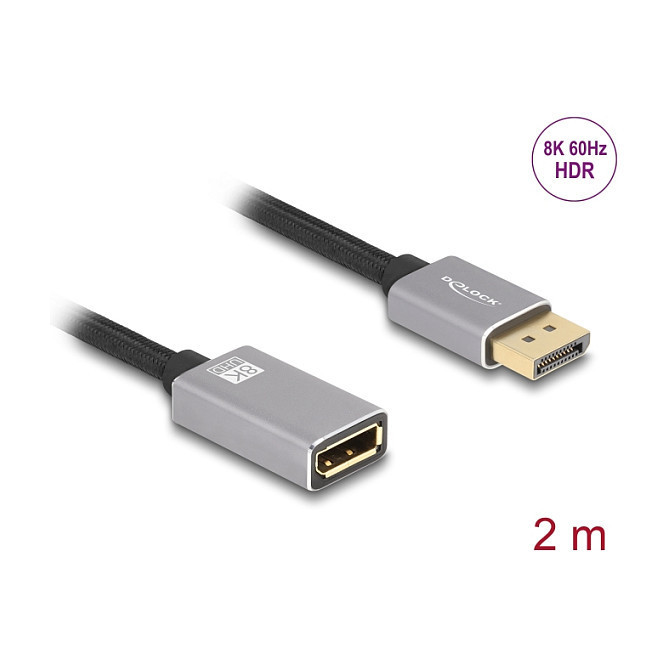 "DeLOCK DisplayPort extension cable 8K 60 Hz 2 m grey metal without latch. Cable length: 2 m, Connector 1: DisplayPort, Connector 2: DisplayPort. Cable diameter: 6 mm. Package type: Hanging box. Country of origin: China"\n"This DisplayPort cable by Delock enables the extension of a DisplayPort connection.