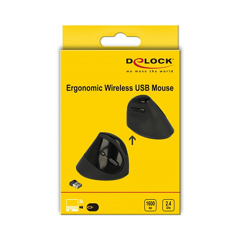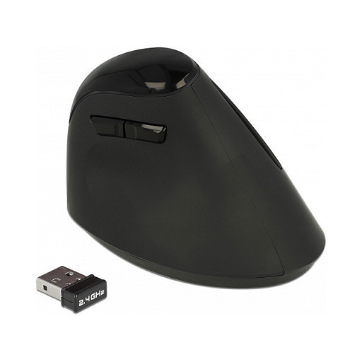 "DeLOCK 12599. Form factor: Right-hand, Vertical design. Device interface: RF Wireless, Movement resolution: 1600 DPI, Buttons type: Pressed buttons, Buttons quantity: 4, Scroll type: Wheel. Laser colour: Red. Power source: Batteries. Works on any surface. Product colour: Black"\n"This wireless vertical mouse by Delock is suitable for right handers and will be connected to the computer via the compact USB receiver. During transport it can be placed inside a compartment at the bottom of the mouse. The 2.4 GHz wireless technology provides a maximum operating range of up to 20 meters. Due to its ergonomic design, the hand remains in upright position and does not have to be turned. Thus the mouse can be used preventive or with starting pain e.g. RSI (Repetitive-Strain-Injury). There are three adjustable DPI levels to adapt the sensitivity of the mouse."