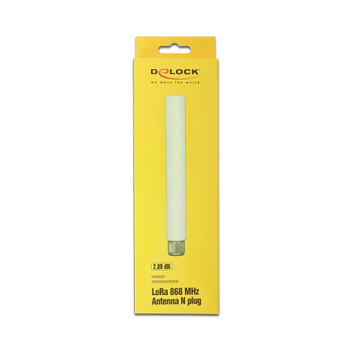 "DeLOCK 89637. Antenna gain level (max): 2.09 dBi, Frequency band: 0.868 GHz, Impedance: 50 Ω. Antenna type: Omni-directional antenna, Antenna connector type: N-type, Connector gender: Male. Height: 187 mm, Diameter: 2.3 cm. Package type: Box. Country of origin: Taiwan"\n"This antenna by Delock allows the usage of the 868 MHz band indoors and outdoors."