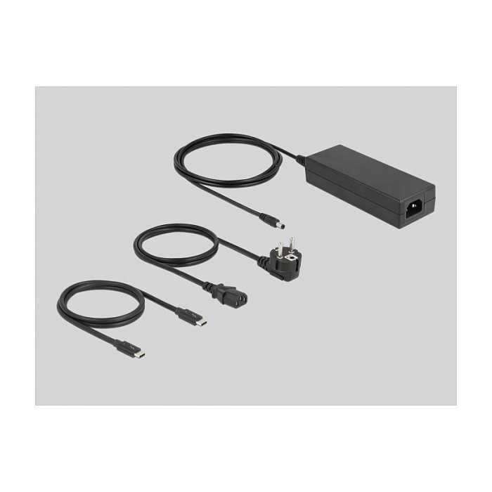 The included power supply supplies the hub, the devices connected to the hub and the host device with power, maximum 85 watts. There is a dynamic distribution of power. This means that the laptop can be charged with a maximum of 60 watts and then 25 watts are available for the hub. If the laptop requires less power to charge, there is correspondingly more power available for the hub, but a maximum of 54.5 watts. Each of the three downstream Thunderbolt™ ports offers a maximum power of 15 watts, while the USB Type-A port offers max. 4.5 watts."