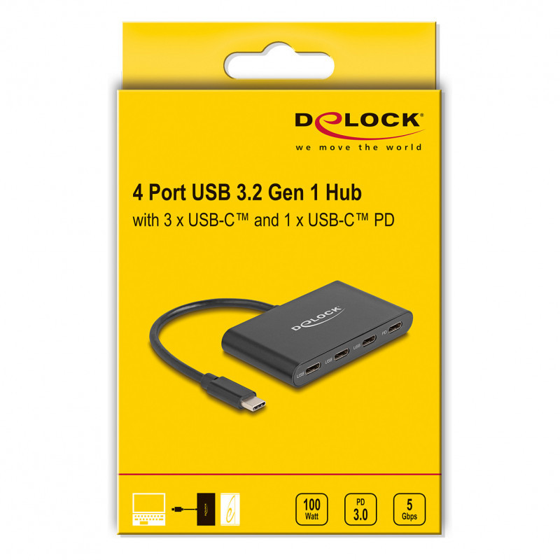 "DeLOCK USB 3.2 Gen 1 USB Type-C Hub with 3 x USB Type-C female + 1 x USB Type-C PD 100 Watt. Host interface: USB 3.2 Gen 1 (3.1 Gen 1) Type-C, Hub interfaces: USB 3.2 Gen 1 (3.1 Gen 1) Type-C. Data transfer rate: 5000 Mbit/s, Product colour: Black, Housing material: Aluminium. Power supply type: USB. Windows operating systems supported: Windows 10, Windows 11, Windows 8.1, Mac operating systems supported: Mac OS X 12.0 Monterey, Mac OS X 13.0 Ventura, Linux operating systems supported: Linux Kernel 5.11, Linux Kernel 5.12, Linux Kernel 5.13, Linux Kernel 5.14, Linux Kernel 5.15. Width: 43 mm, Depth: 77 mm, Height: 11 mm"\n"The USB hub by Delock is the mobile companion for laptops or tablets with USB Type-C™ connection. Up to 3 USB Type-C™ devices can be connected to the hub.